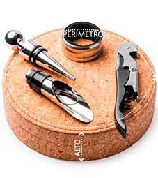 Set de vino con accesorios en acero inoxidable, sacacorchos de 2 tiempos con cortacápsulas, recogegotas y dosificador.