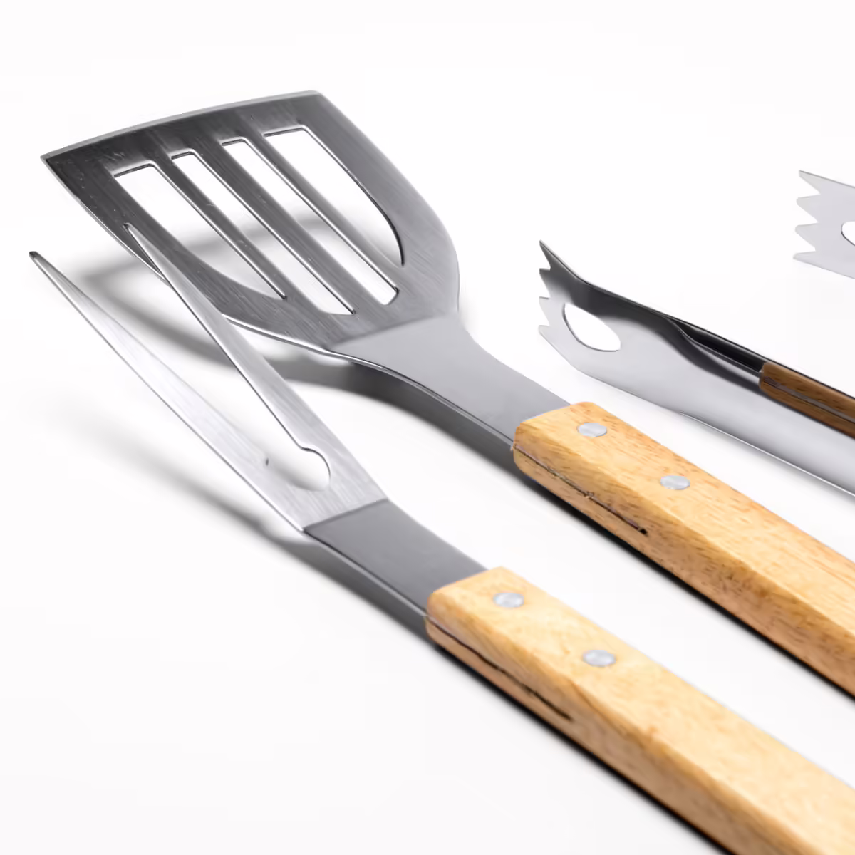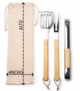 Set para barbacoa. 3 accesorios de acero inoxidable con mango de madera: Trinchador, pinza y espátula. Incluye funda de algodón.