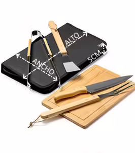 Set para barbacoa. Incluye 4 accesorios de acero inoxidable con mango de madera: Cuchillo, trinchador, pinzas, espátula y una tabla de cortar realizada en madera.