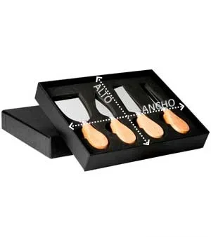 Set para quesos con 4 utensilios de acero inoxidable y mango de madera. Presentados en un elegante estuche con interior acolchado.