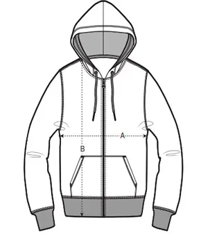 Manga pegada Capucha forrada con punto de jersey Cordón redondo en el mismo tono rematado con puntas de acabado metálico Bies interior de espiga en cuello y cremallera Ojales y cremallera metálicos Cremallera delantera central cubierta Media luna interior en tejido principal Canalé 1×1 en puños y bajo Puntada de recubierto en todas las costuras Bolsillo de canguro con puntada de recubierto