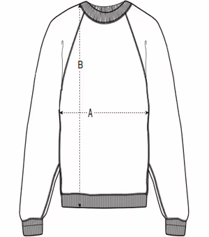 Mangas raglán Costillas 2X1 en cuello, puños de las mangas y dobladillo inferior Costura plana de tres agujas en el cuello, mangas, costuras laterales y media luna Costuras de dos agujas en el dobladillo inferior y puños de las mangas Cinta interior del cuello de grosgrain Media luna de la misma tela en la nuca