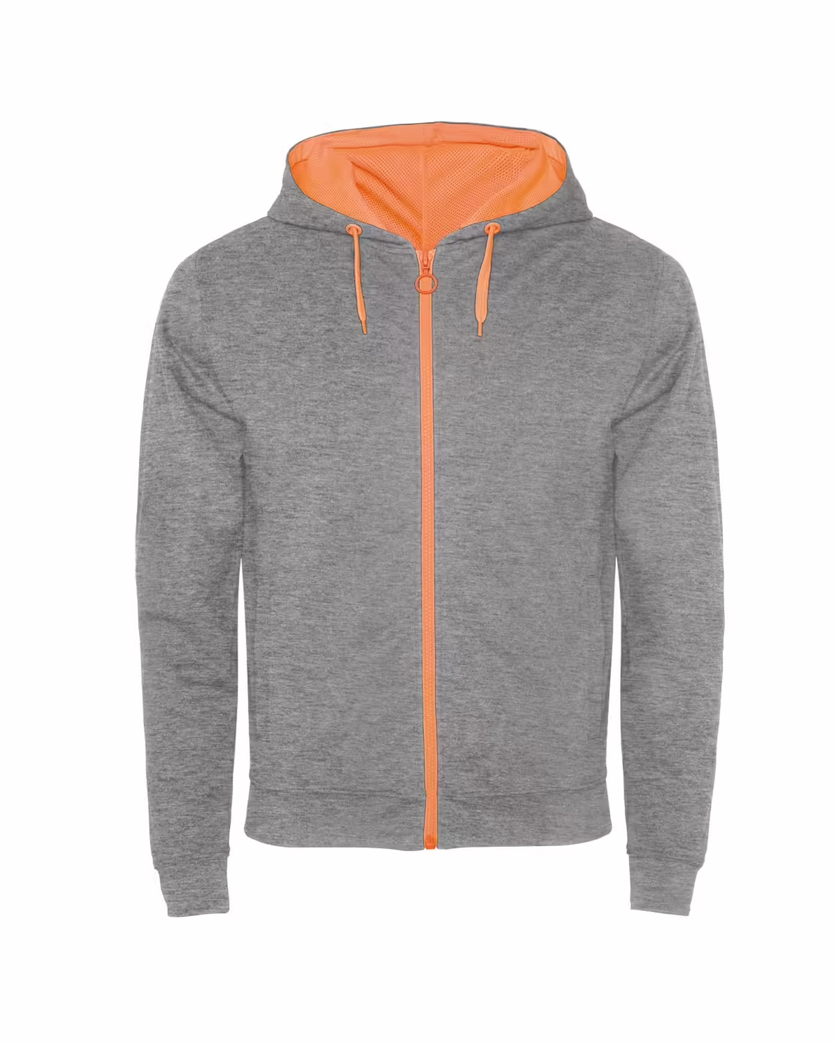 Para empezar, la cremallera central con tirador destaca por su contraste color flúor. La capucha con forro interior (que por cierto es de poliéster microperforado) presenta también contraste de color flúor. Y el cordón y los ojales metálicos, más de lo mismo.