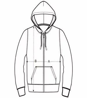 Mangas montadas Capucha forrada con la misma tela Cremallera metálica cubierta en el centro delantero Cordones redondos del mismo color del cuerpo con acabado metálico cerrado Ojales metálicos Ribete de 1×1 en puños de las mangas y dobladillo inferior Bolsillo canguro Costura de doble aguja en sisa, puños de las mangas y dobladillo inferior Cinta de espiga en la costura interior del cuello y dentro de la cremallera Media luna de tela de la misma en la nuca
