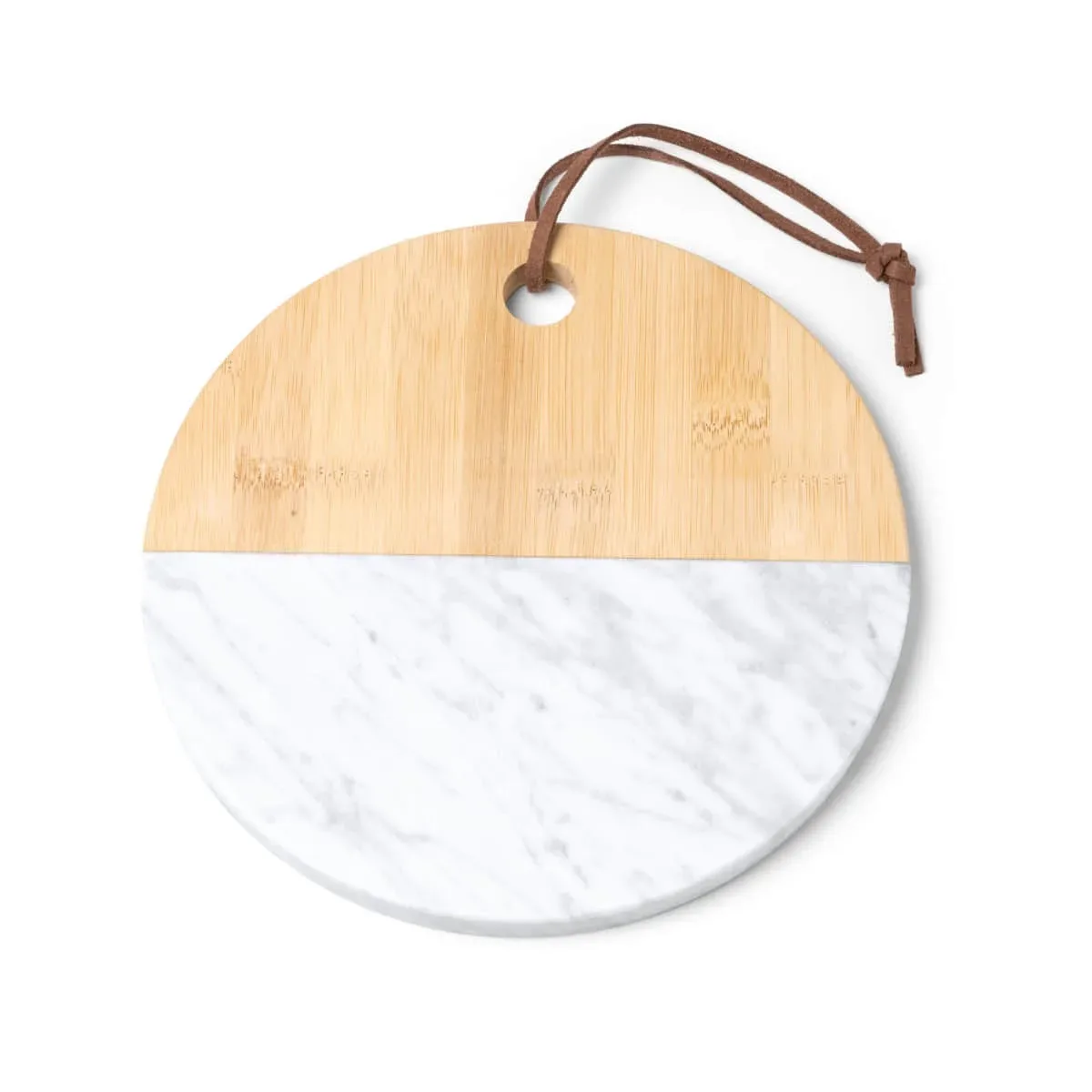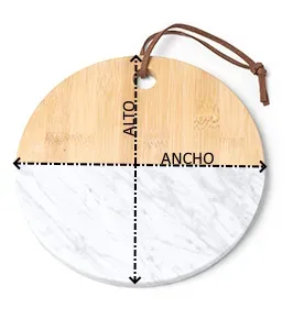 Tabla realizada en bambú y marmol natural. Incluye cinta para transporte en polipiel.