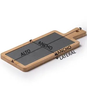 Su diseño rectangular con esquinas redondeadas proporciona una amplia área de trabajo, mientras que la pizarra incorporada da un diseño mas gastronómico a la presentación de tus productos. El mango integrado facilita el manejo y el transporte de la tabla, brindándote comodidad en cada uso.