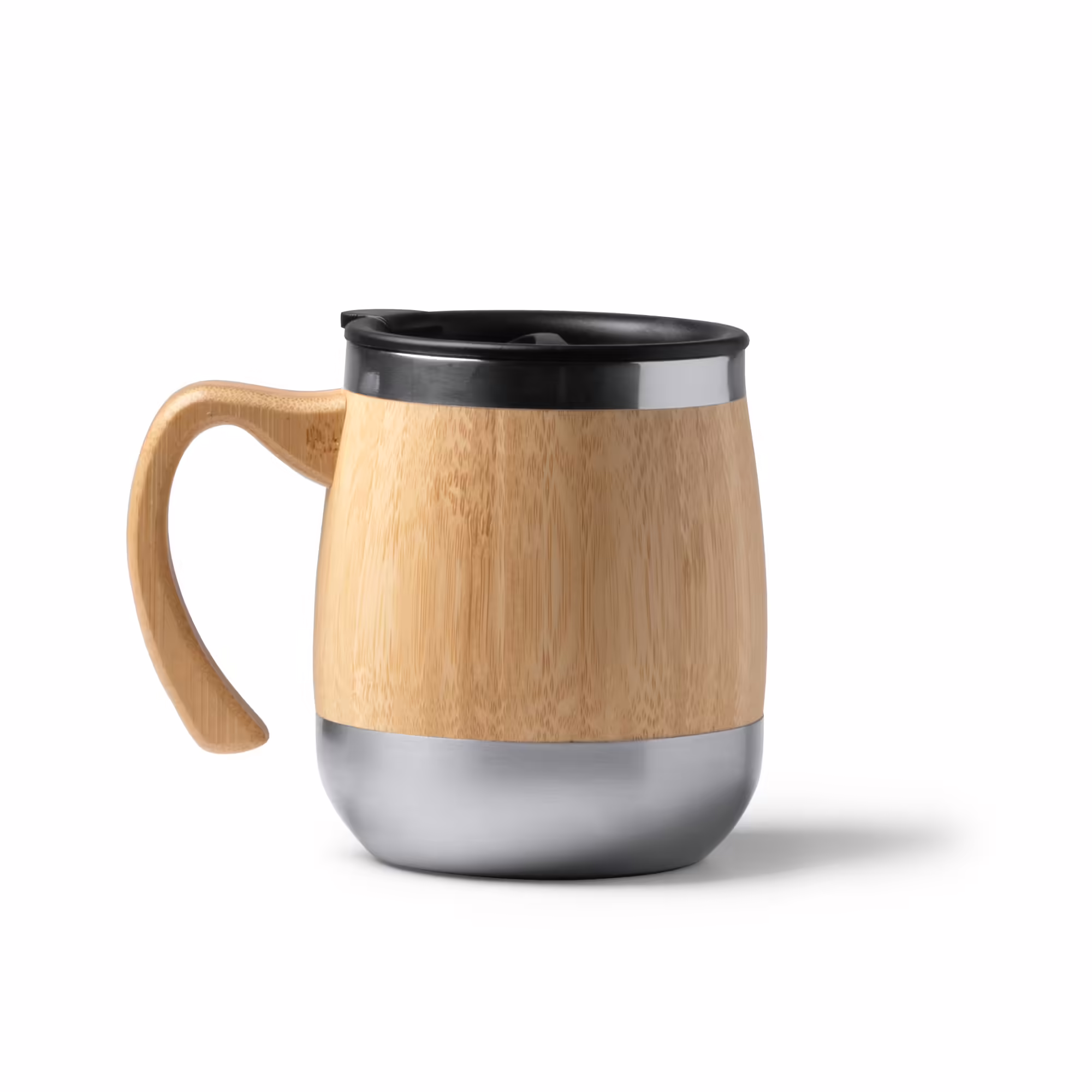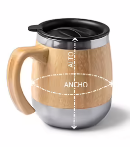 Taza de acero inoxidable 304 de doble pared con exterior en bambú. Capacidad 450 ml.