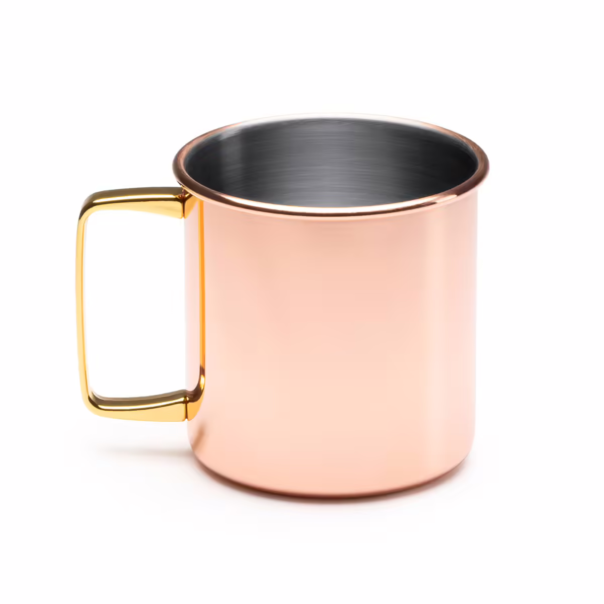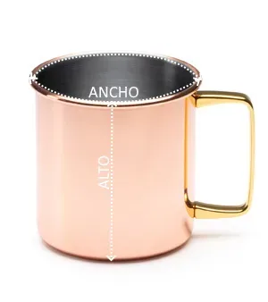 La taza de acero inoxidable con recubrimiento de cobre exterior y asa dorada es una elección elegante y sofisticada para disfrutar de tus bebidas favoritas con una capacidad de 480 ml. El acero inoxidable garantiza su durabilidad y resistencia, mientras que el recubrimiento de cobre exterior le proporciona un aspecto distintivo y elegante.