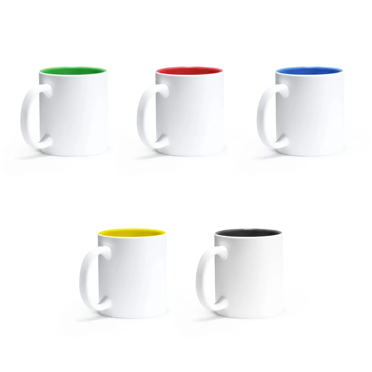 Taza de cerámica ideal para marcaje láser. Interior a color y exterior blanco. Capacidad 350 ml. Realiza tus diseños, combinándolos con los colores interiores de la taza.
