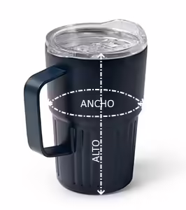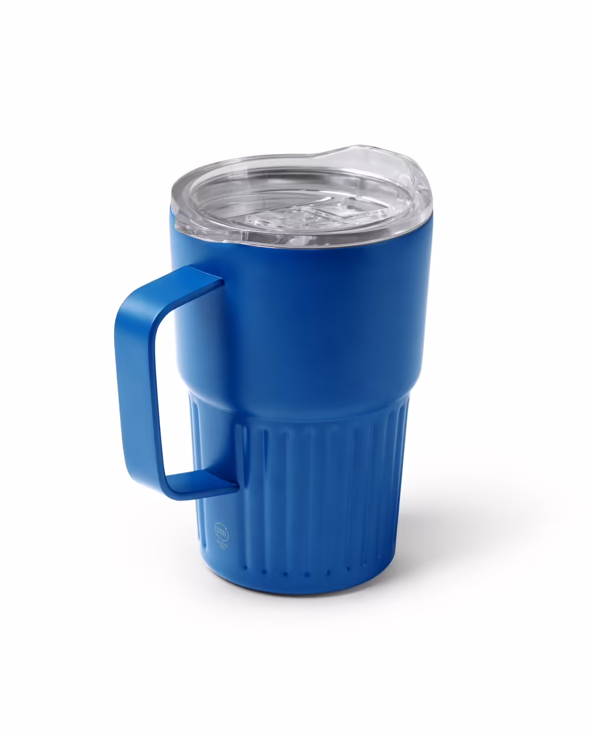 Taza térmica de acero inoxidable 304 reciclado con diseño biselado de doble pared. Tapa de seguridad transparente. Capacidad 450 ml.
