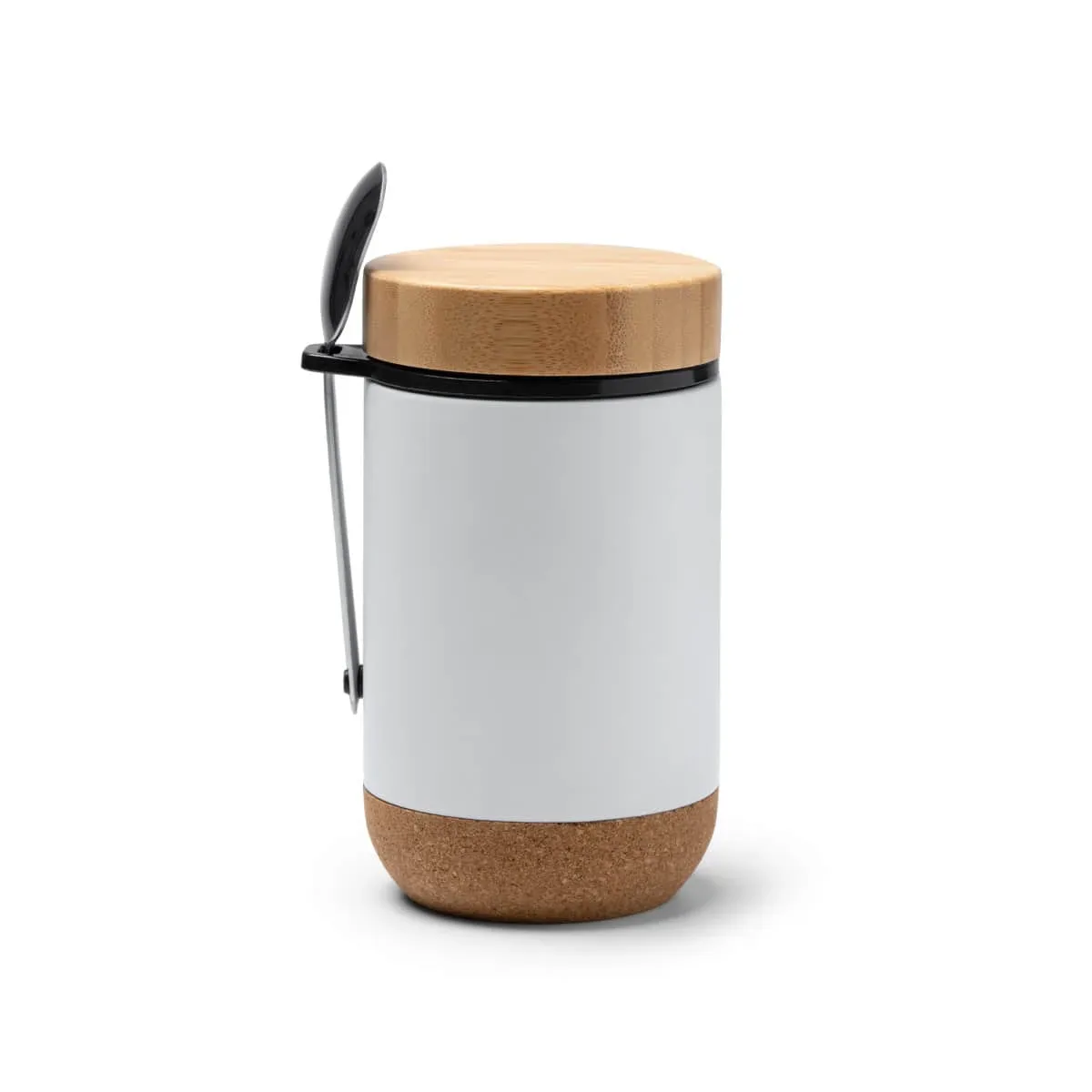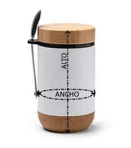Termo multiusos ideal para comida de acero inoxidable 304. Tapa de bambú y base de corcho. Incluye cuchara. Capacidad 400 ml.
