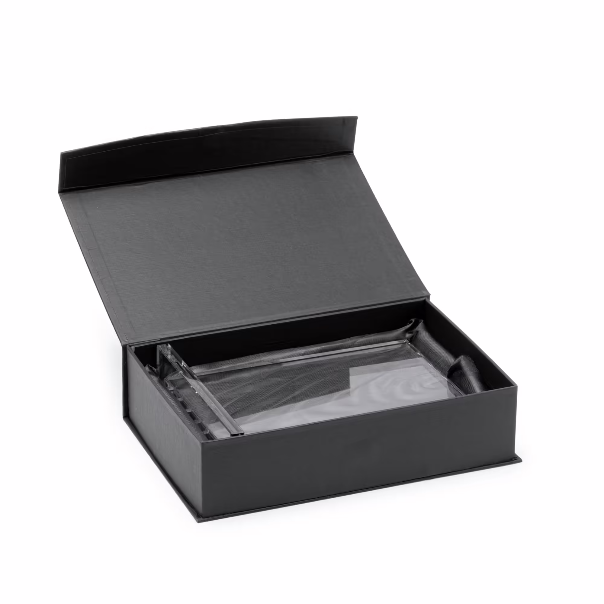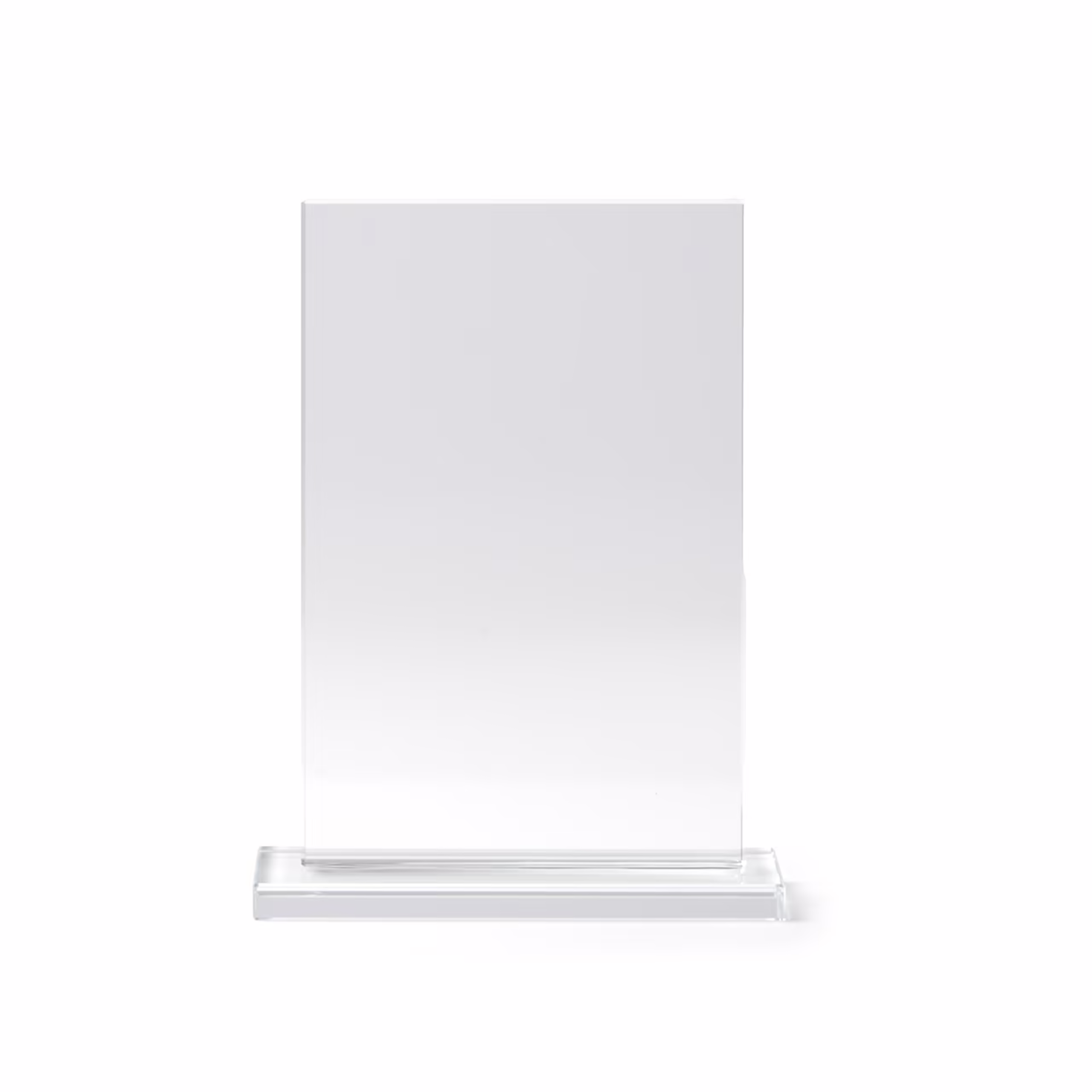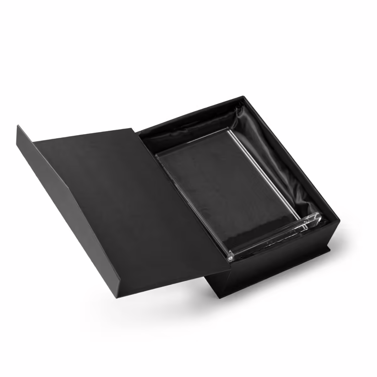 Trofeo de cristal de diseño rectangular. Incluye estuche de presentación en color negro.