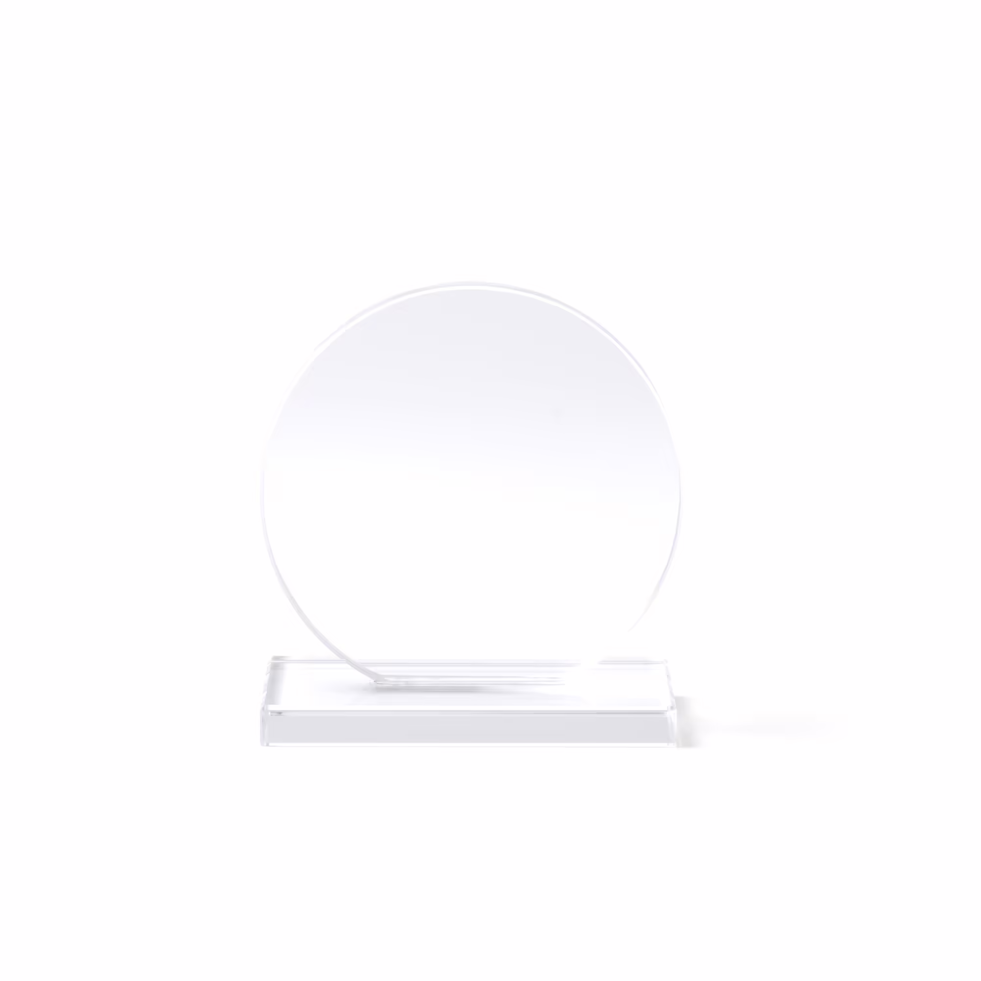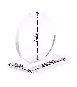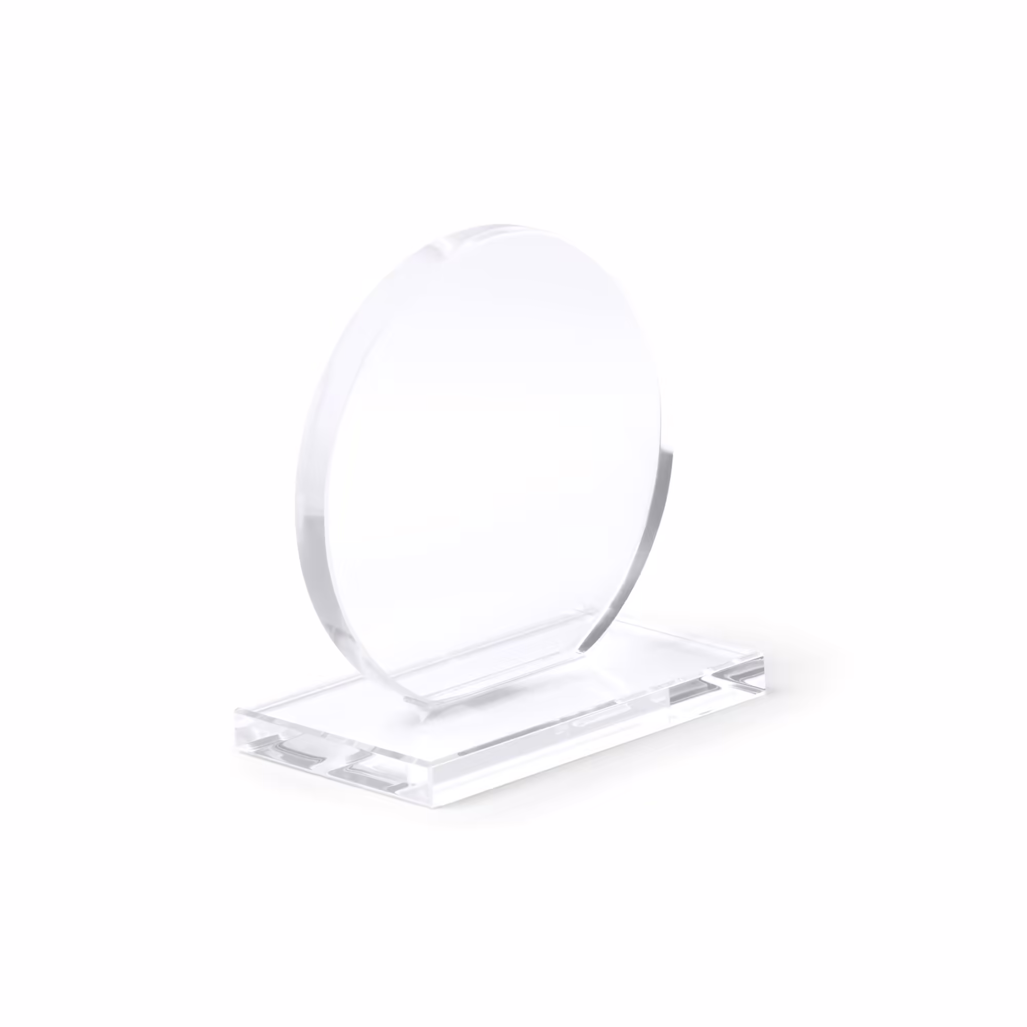 Trofeo de cristal de diseño circular con base rectangular. Incluye estuche de presentación en color negro.