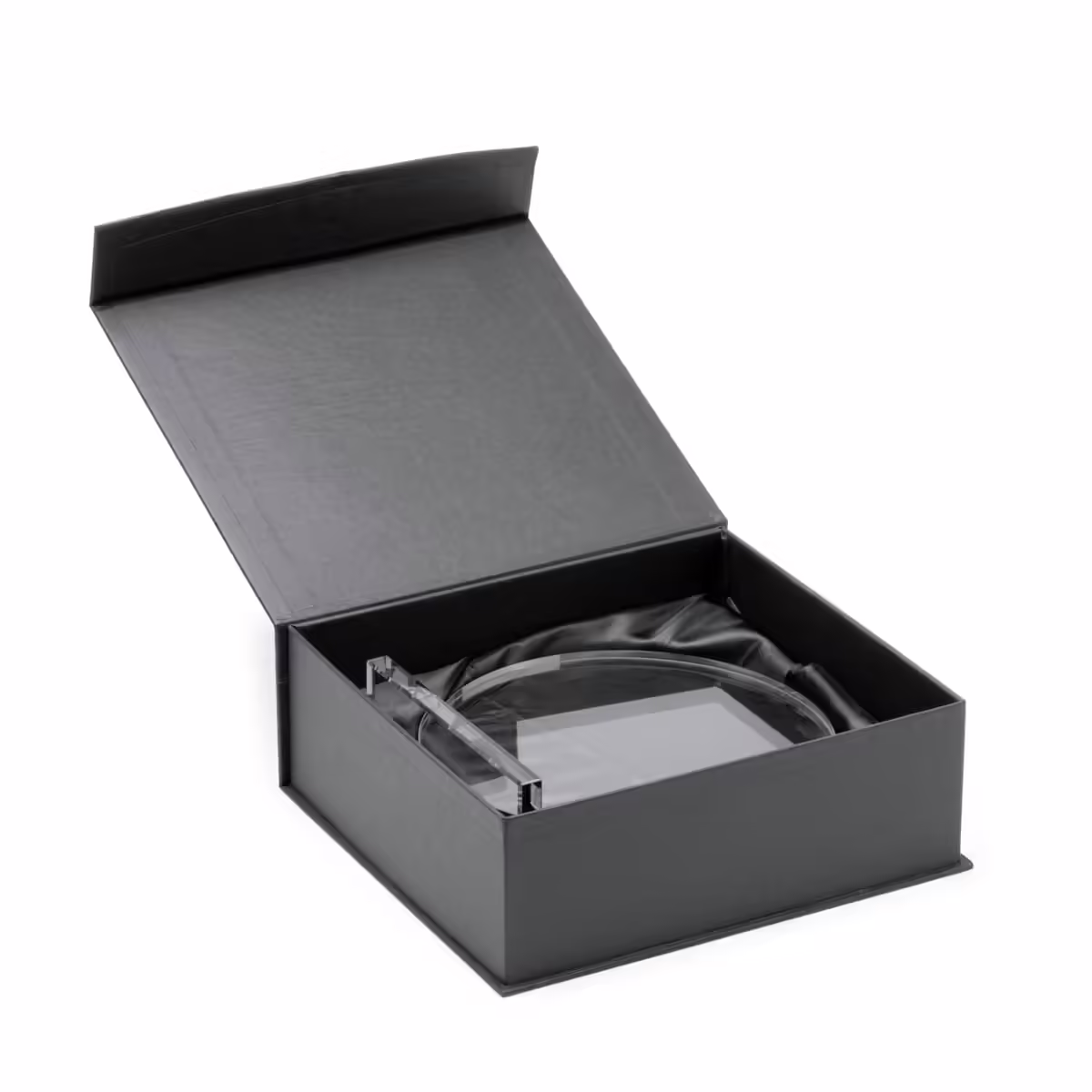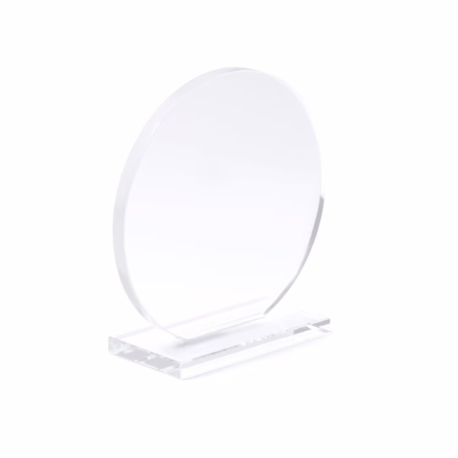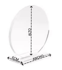 Trofeo de cristal de diseño circular con base rectangular. Incluye estuche de presentación en color negro.