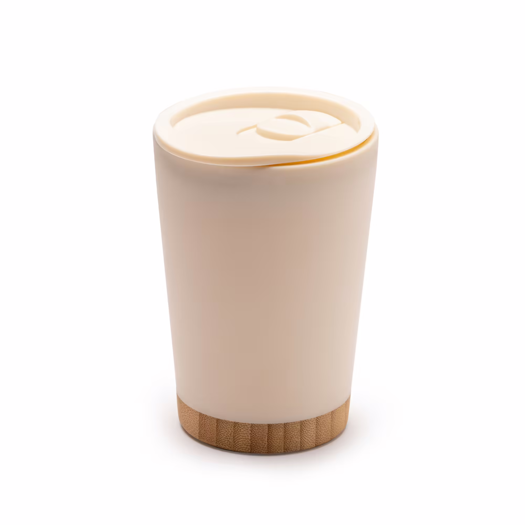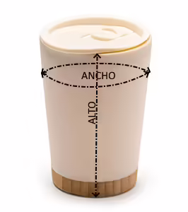 Vaso con cuerpo de PP reciclado de doble pared y base de bambú. Incluye tapa dosificadora. Capacidad de 290 ml.