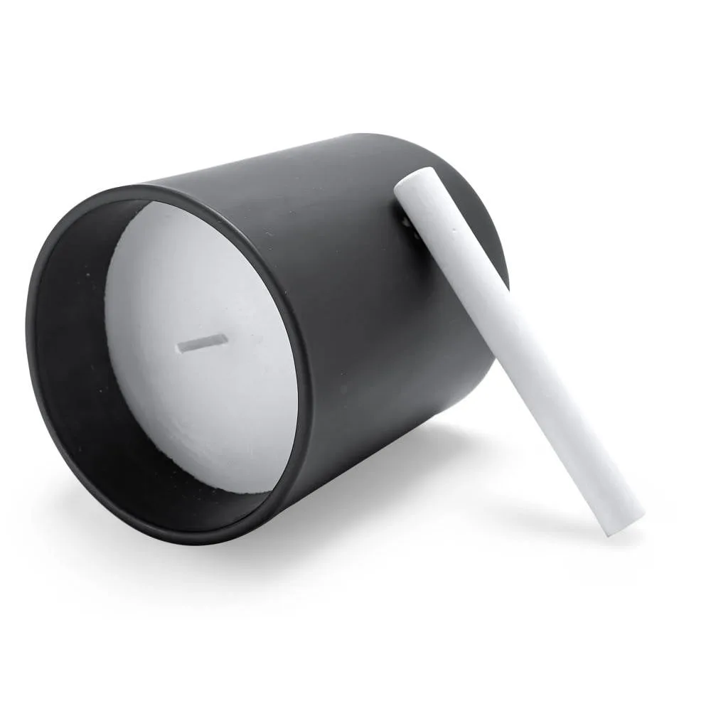 Vela aromática en recipiente cerámico negro redondo. Incluye una tiza para escribir sobre el recipiente. Vela y mecha blancas. Fragancia de vainilla.