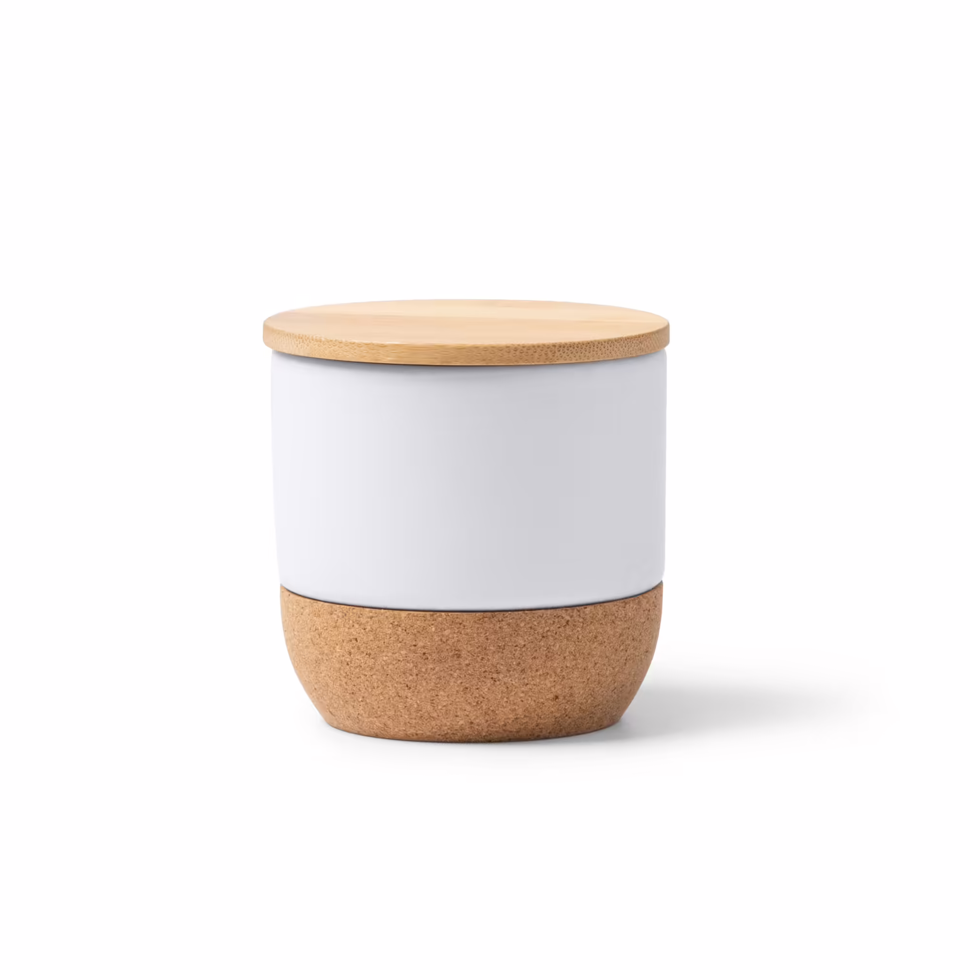La vela aromática está contenida en un recipiente de cerámica con base de corcho y tapa de bambú. Hecha con cera vegetal, emana un agradable aroma a vainilla, ideal para crear un ambiente acogedor y relajante en cualquier espacio.